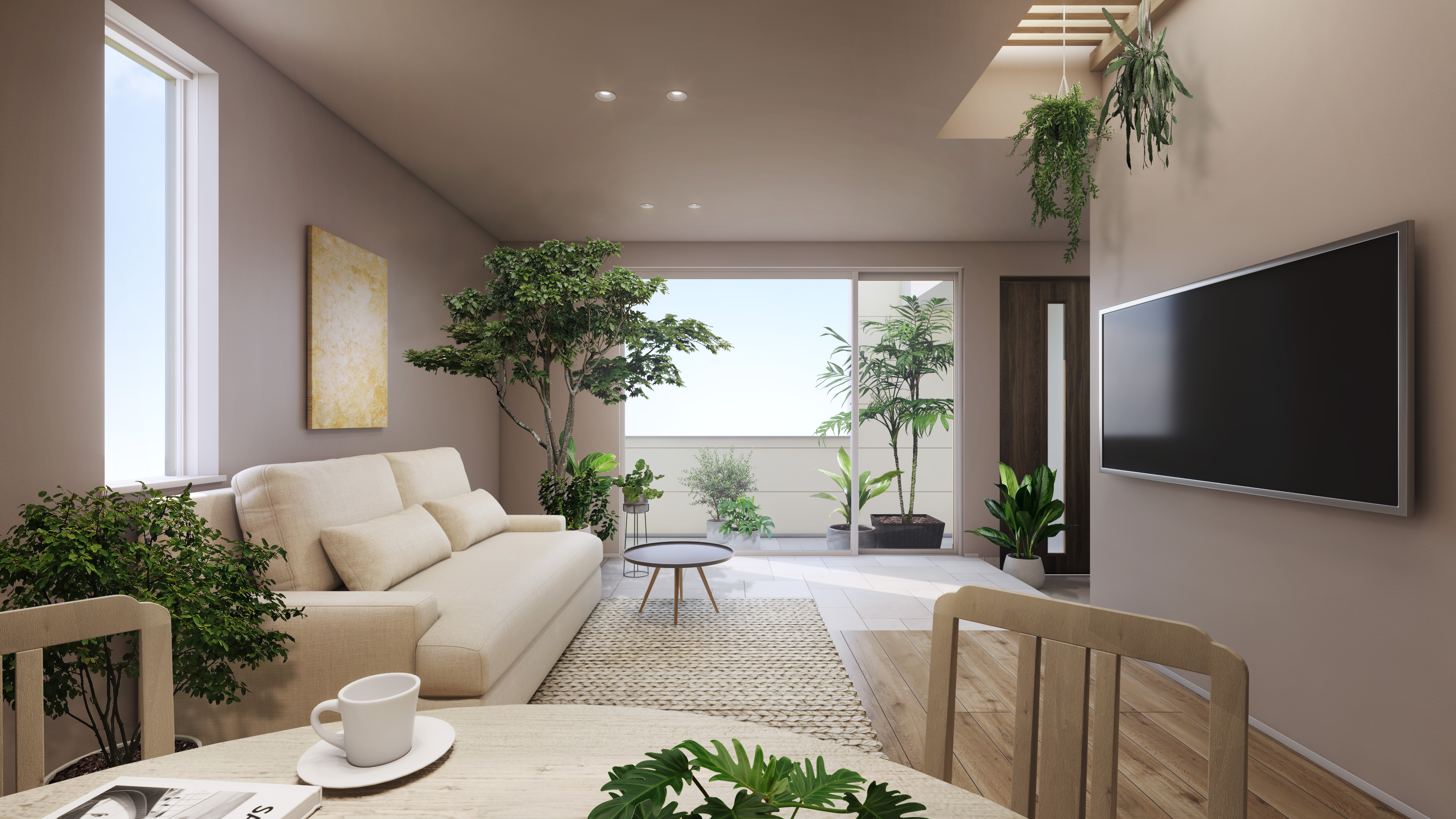 リビングに差し込むやわらかな光や、グリーンのある風景に、