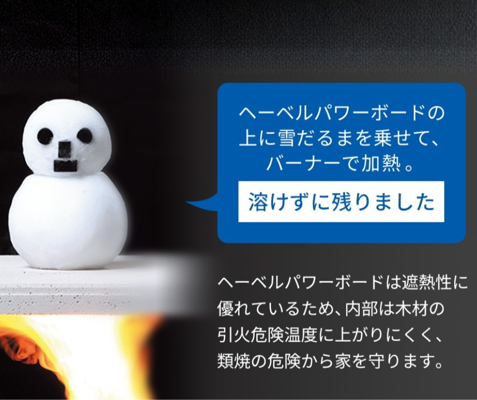 防火性能もしもの時に備える、命を守る構造万一の火災にも、家族の安全を守るために。外壁には耐火性に優れたヘーベルパワーボード、開口部には熱を通しにくい樹脂サッシを採用。内部の下地にも石膏ボードを使用し、火の広がりを抑える構造としています。 |
